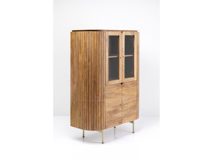 Μοντέρνο, αριστοκρατικό και με μια νότα πολυτέλειας, αυτό το ντουλάπι θα ανεβάσει το σαλόνι σας στο επόμενο επίπεδο όσον αφορά το εσωτερικό. Ο συνδυασμός των επεξεργασμένων υλικών είναι ένα θέαμα από μόνος του. Κατασκευασμένο από μασίφ ξύλο μάνγκο με μαρμάρινη κορυφή υψηλής ποιότητας και χρυσά πόδια, αυτό το έπιπλο σαλονιού είναι γεμάτο στυλ. Το οβάλ σχήμα προσθέτει επίσης την τελική πινελιά. Όχι χωρίς λόγο, η βιτρίνα είναι ένα μοναδικό στο είδος του κομμάτι χάρη στη χειροποίητη κατασκευή του και προβάλλει τέλεια τα ποτήρια κρασιού, τα μπουκάλια και τις διακοσμητικές ιδέες σας. Στην κουζίνα, το σαλόνι ή την τραπεζαρία: το ντουλάπι είναι ολόπλευρο και προσφέρει αρκετό χώρο χάρη σε δύο πόρτες και τέσσερα διαμερίσματα - επιπλέον, οι μεντεσέδες είναι ρυθμιζόμενοι.Ασυνήθιστο ξύλινο ντουλάπι με γυάλινη προθήκη