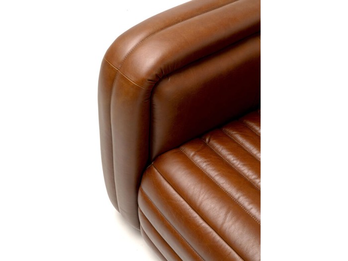 Ένα κομψό και στιβαρό armchair που αποπνέει πολυτέλεια και διαχρονικό στυλ. Το βαθύ καφέ δέρμα του αγκαλιάζει τη φόρμα του με ανάγλυφες ραφές, προσφέροντας έναν ιδιαίτερο χαρακτήρα που θυμίζει vintage αυτοκίνητα πολυτελείας. Ο σχεδιασμός του συνδυάζει άνεση και ανθεκτικότητα χάρη στην εσωτερική κατασκευή από μασίφ ξύλο ευκαλύπτου και πεύκου, ενώ η επένδυση από ημιάναλινο δέρμα αγελάδας εξασφαλίζει φυσική υφή και μαλακή αφή. Η ελαστική ανάρτηση (Nosag και ιμάντες) προσφέρει ιδανική στήριξη και εργονομία, κάνοντάς το ιδανικό για στιγμές χαλάρωσης με στυλ.