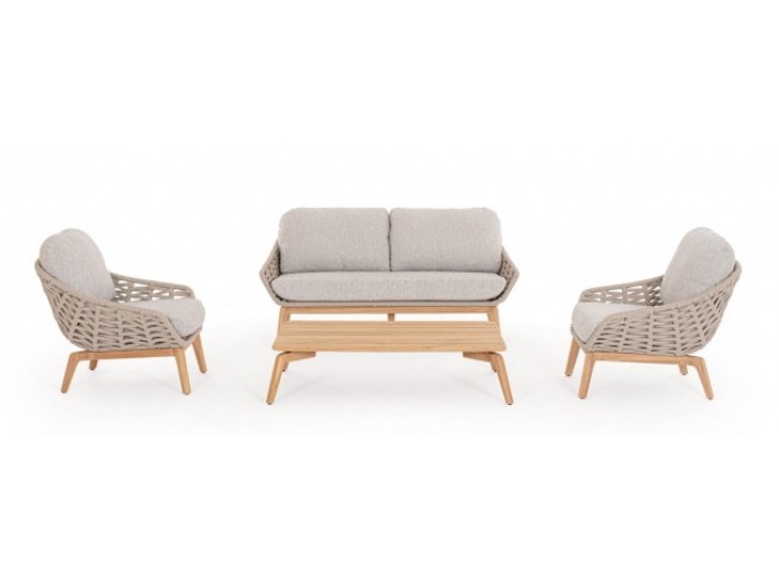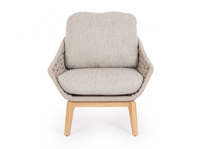 Πολυθρόνα Τέλειου design και άνεσης με πλαίσιο αλουμινίου και πόδια από teak. Η πλάτη διαθέτει ύφανση κατάλληλη για εξωτερικούς χώρους από σχοινί . Τα μαξιλάρια διαθέτουν αποσπώμενο κάλυμμα από ύφασμα με αντηλιακή προστασία για καλύτερη χρήση. Βίδες από ανοξείδωτο χάλυβα.
