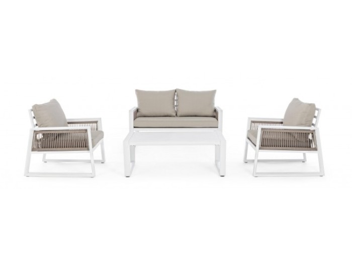 Καθιστικό 4 κομματιών αποτελούμενο από ένα τραπέζι μέσης και 3 καθίσματα. Κατασκευασμένο από αλουμίνιο και πολυεστέρα ηλεκτροστατικής βαφής σε άσπρο-γκρι χρώμα.Τα καλύμματα των μαξιλαριών είναι αποσπώμενα.