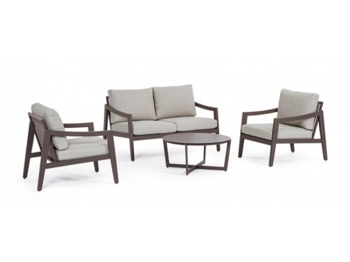 Σαλόνι εξωτερικού χώρου, που αποτελείται από έναν διθέσιο καναπέ, δύο πολυθρόνες κι ένα τραπέζι μέσης. Το τραπέζι είναι από αλουμίνιο σε χρώμα καφέ και με στρογγυλή επιφάνεια. Ο καναπές και οι πολυθρόνες έχουν σκελετό από αλουμίνιο σε χρώμα καφέ και μαξιλάρια καθίσματος και πλάτης, υφασμάτινα με αφαιρούμενο κάλυμμα σε χρώμα ανοιχτό γκρι. Μια εξαιρετική επιλογή για τον χώρο σας!