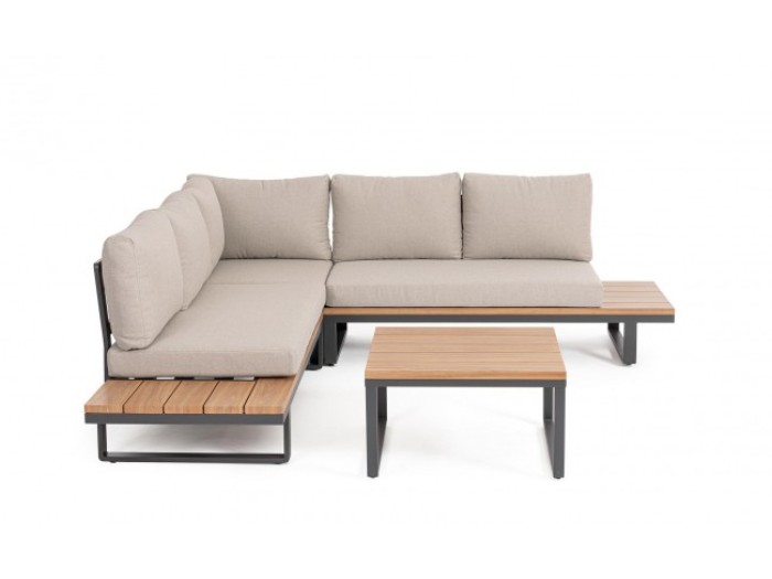 Πλαϊνά και Επιφάνεια Τραπεζιού Καφέ με Επικάλυψη Ξύλου: Τα πλαϊνά του καναπέ και η επιφάνεια του τραπεζιού καφέ διαθέτουν επικάλυψη που μοιάζει με ξύλο, συνδυάζοντας την κομψότητα του μετάλλου με την ζεστή εμφάνιση του ξύλου, προσφέροντας μία φυσική και μοντέρνα αίσθηση.