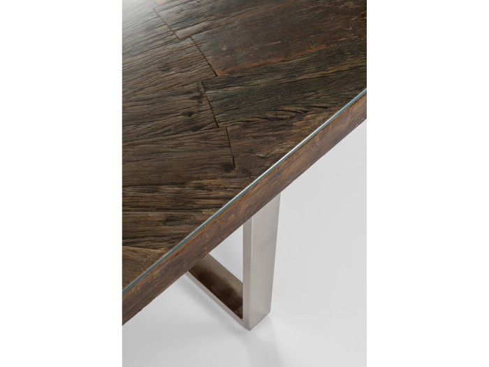 Τραπέζι κατασκευασμένο από ορειχάλκινο ατσάλινο σκελετό ηλεκτροστατικής βαφής και επιφάνεια από μασίφ ξύλο ακακίας και μάνγκο με γυαλί ασφαλείας.