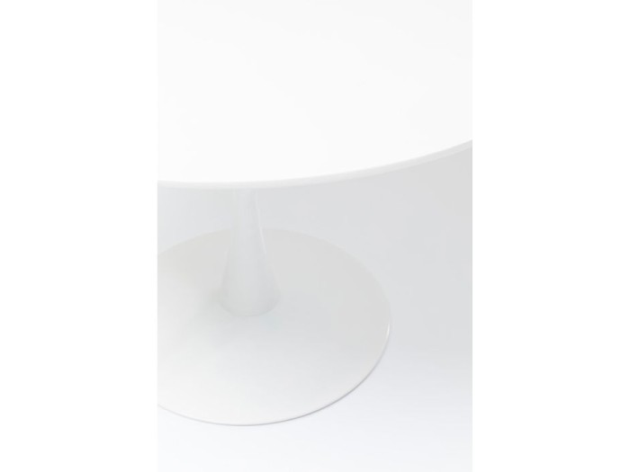 Ένα στρογγυλό μοντέρνο τραπέζι με το καλύτερο ρετρό σχέδιο σε χιονόλευκο χρώμα, επιτραπέζιο καπάκι ματ λευκό, επιτραπέζιο πόδι γυαλιστερό λευκό