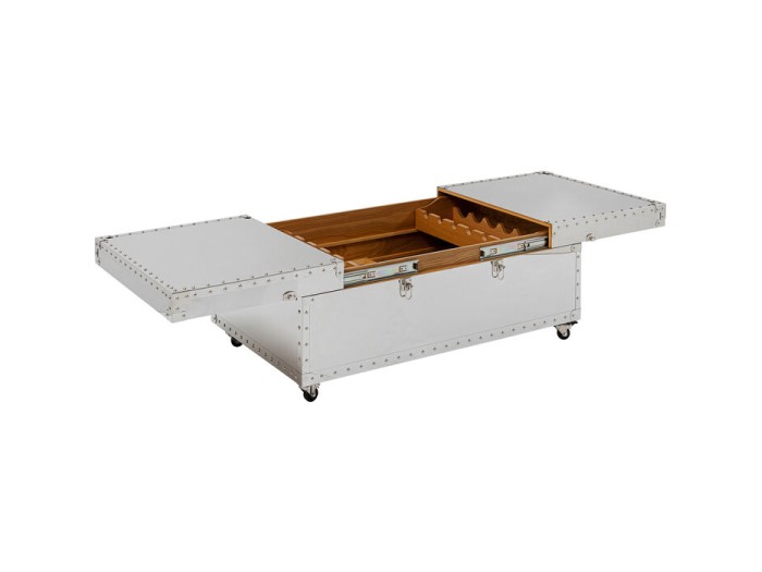 Το δικό σας μπαρ στο σπίτι προσφέρει πολλά πλεονεκτήματα, ειδικά όταν είναι κρυμμένο σε ένα αναδιπλούμενο τραπεζάκι του καφέ. Αυτό το πρακτικό μοντέλο, ένας συνδυασμός ορθογώνιου μεταλλικού τραπεζιού σαλονιού με μπαρ, όχι μόνο προσφέρει άφθονο αποθηκευτικό χώρο για διάφορα ποτά και αξεσουάρ, αλλά επιτρέπει επίσης την επαγγελματική αποθήκευση των φιαλών κρασιού σε οριζόντια θέση. Μπορείτε να εκπλήξετε τους πάντες με ένα οικιακό μπαρ αυτού του τύπου! Παρουσιάστε ποτά με στυλ και δροσίστε τους καλεσμένους σας με αφρώδη αναψυκτικά ανά πάσα στιγμή.Τραπέζι σαλονιού σε ασημί χρώμα με τροχούς και δυνατότητες αποθήκευσης, 36,5 x 120 x 75 cm (Υ/Β/Δ)