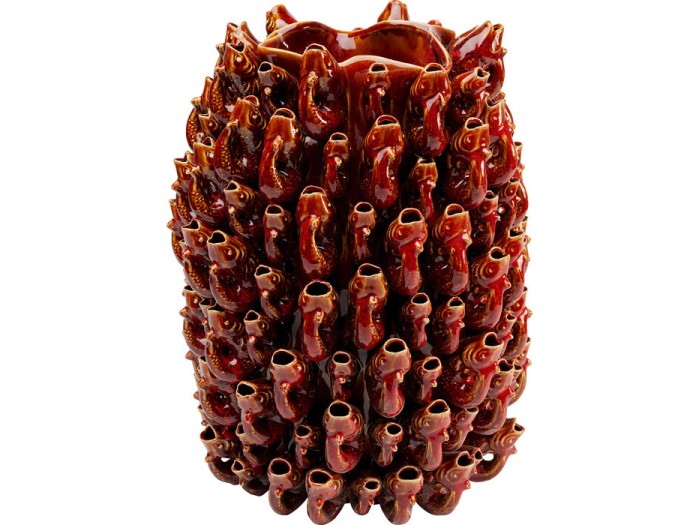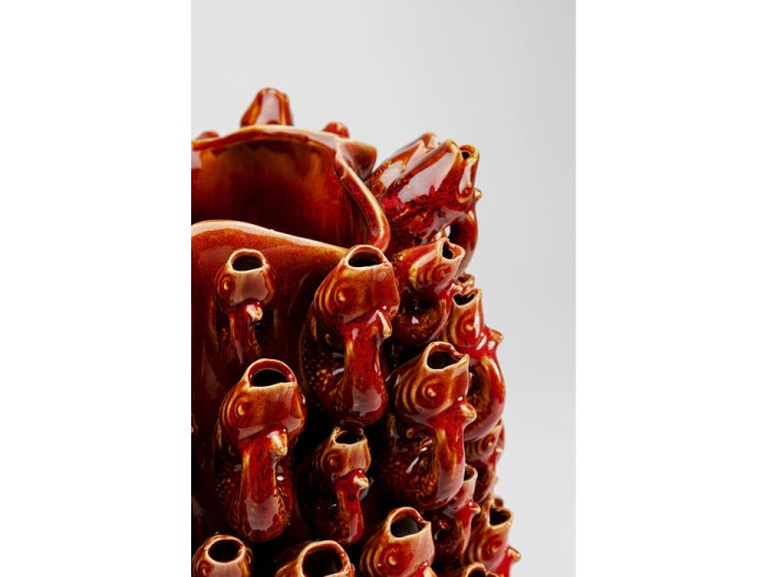 Αυτό το επιβλητικό βάζο σε βαθύ κόκκινο χρώμα αποτελεί ένα αυθεντικό έργο τέχνης που μαγνητίζει το βλέμμα με την τρισδιάστατη, χειροποίητη υφή του. Η επιφάνεια καλύπτεται από δεκάδες οργανικές, κοραλλιογενείς μορφές που θυμίζουν στοιχεία από τον βυθό, δημιουργώντας μια sculptural παρουσία με έντονη κίνηση και δραματικό χαρακτήρα. Το λακαρισμένο stoneware αναδεικνύει τις αποχρώσεις του κόκκινου—από κεραμιδί έως βαθύ μπορντό—προσδίδοντας πολυτέλεια, ζωντάνια και αισθησιασμό στο αντικείμενο.