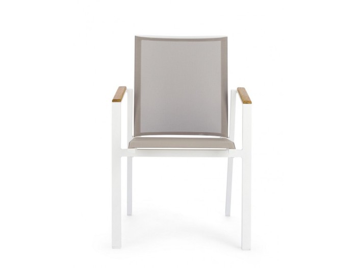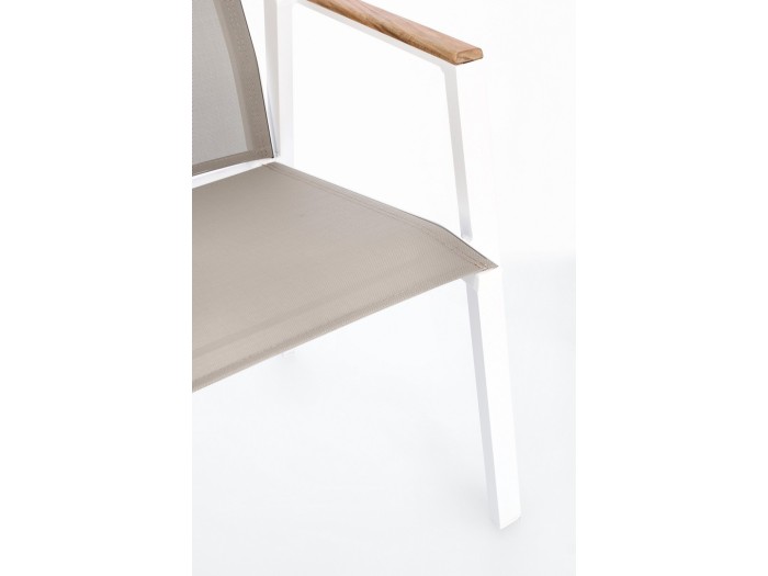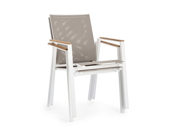 Η Καρέκλα Εξωτερικού Χώρου Cameron συνδυάζει μοντέρνα σχεδίαση με ανθεκτικότητα και πρακτικότητα. Κατασκευασμένη από αλουμίνιο με ηλεκτροστατική βαφή λευκού χρώματος, είναι ελαφριά, στιβαρή και κατάλληλη για χρήση σε εξωτερικούς χώρους. Τα μπράτσα της καρέκλας διαθέτουν λεπτομέρειες από φυσικό ξύλο Teak, προσφέροντας έναν ζεστό, φυσικό τόνο στην εμφάνιση της. Η πλάτη και το κάθισμα είναι φτιαγμένα από συνθετικό ύφασμα textilene, το οποίο είναι ανθεκτικό στη βροχή και τις υπεριώδεις ακτίνες του ήλιου, καθιστώντας την εξαιρετική επιλογή για εξωτερικούς χώρους. Επίσης, η καρέκλα είναι στοιβαζόμενη, διευκολύνοντας την αποθήκευση όταν δεν χρησιμοποιείται.