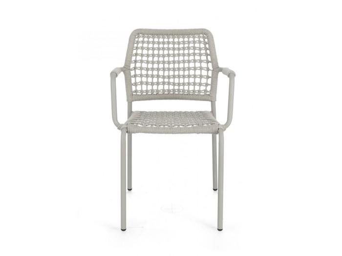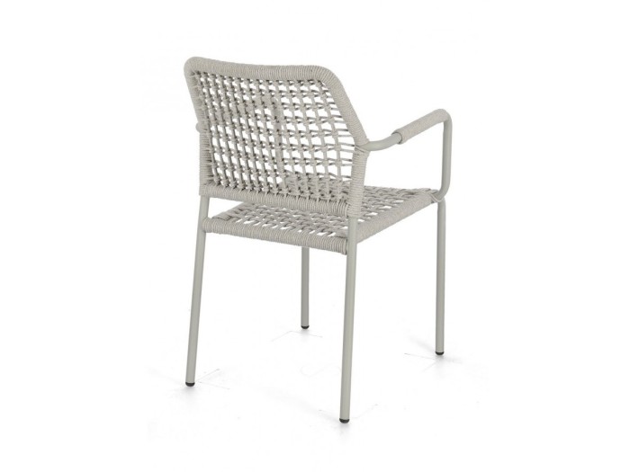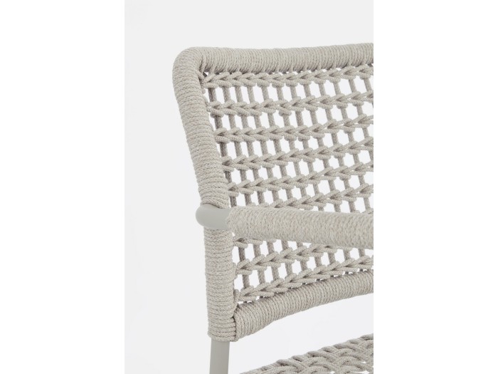 Η καρέκλα κήπου διαθέτει σκελετό από αλουμίνιο με ηλεκτροστατική βαφή (πολυεστέρας), προσφέροντας ανθεκτικότητα και προστασία από τις καιρικές συνθήκες. Η επένδυση είναι από σχοινί πολυεστέρα, ειδικά σχεδιασμένο για εξωτερική χρήση, που εξασφαλίζει μακροχρόνια αντοχή και άνεση.