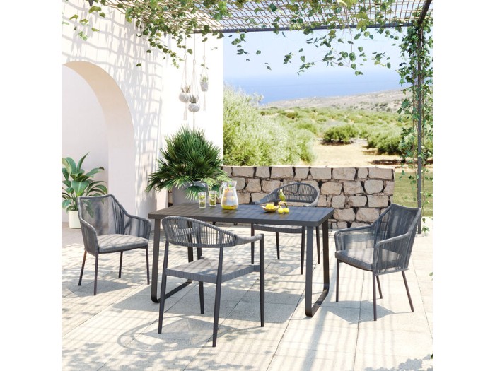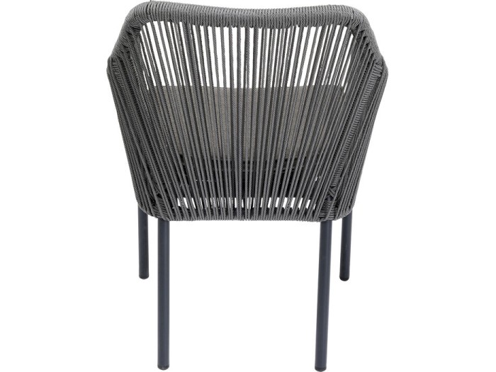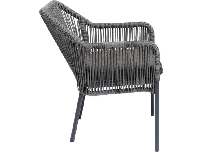 Αυτή η καρέκλα σε γκρι χρώμα είναι κατάλληλη για εξωτερική χρήση και αποτελεί μια γρήγορη και εύκολη αναβάθμιση του στυλ του κήπου σας. Ο κομψός σχεδιασμός με εμφάνιση σχοινιού είναι πραγματικά κλασικός. Τα πλαίσια και τα πόδια είναι κατασκευασμένα από αλουμίνιο και είναι πολύ ανθεκτικά. Η μέγιστη άνεση στο κάθισμα παρέχεται από την αφρώδη επένδυση και το ύψος του καθίσματος των 48,5 cm. Αν το κάλυμμα βραχεί ποτέ, αυτό δεν αποτελεί απολύτως κανένα πρόβλημα, καθώς το μαξιλάρι του καθίσματος είναι βολικά χαλαρό και το κάλυμμα αφαιρείται. Η απλή και κομψή καρέκλα κήπου είναι σίγουρα ένα άνετο αγαπημένο μέρος για να τελειώσουν οι ζεστές καλοκαιρινές μέρες.Μια γκρι καρέκλα εξωτερικού χώρου με μπράτσα και μεταλλικά πόδια
