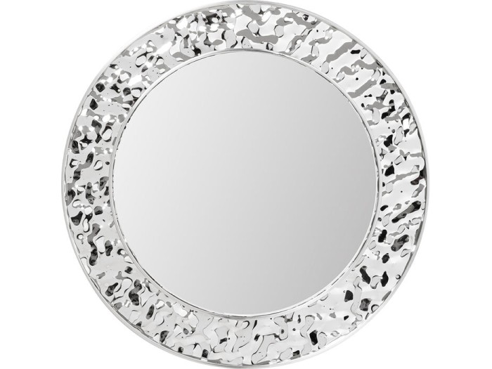 Ο καθρέπτης αποτελεί ένα ιδιαίτερο διακοσμητικό στοιχείο που συνδυάζει καλλιτεχνική αισθητική και σύγχρονο design. Το εντυπωσιακό στρογγυλό του σχήμα πλαισιώνεται από ένα ασημί πλαίσιο με ανάγλυφη, σφυρήλατη υφή που θυμίζει χειροποίητο μεταλλικό έργο τέχνης. Η επιφάνειά του αντανακλά το φως με μοναδικό τρόπο, δημιουργώντας ζωντανές αντανακλάσεις και μια δυναμική παρουσία στον τοίχο.
