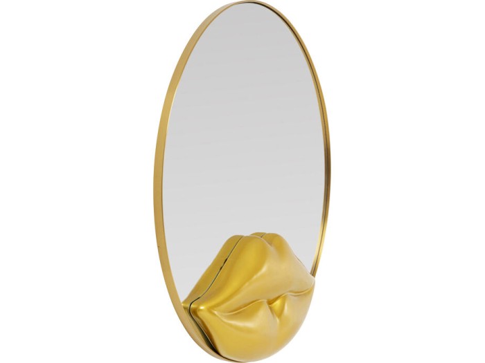 Η επιφάνεια του καθρέφτη πλαισιώνεται από μια λεπτή μεταλλική κορνίζα, ενώ το 3D ανάγλυφο στοιχείο των χειλιών προσθέτει γοητεία, χιούμορ και προσωπικότητα στον χώρο. Ιδανικός για μοντέρνα καθιστικά, υπνοδωμάτια ή χώρους υποδοχής, συνδυάζεται άψογα με χρυσές ή μαύρες πινελιές.