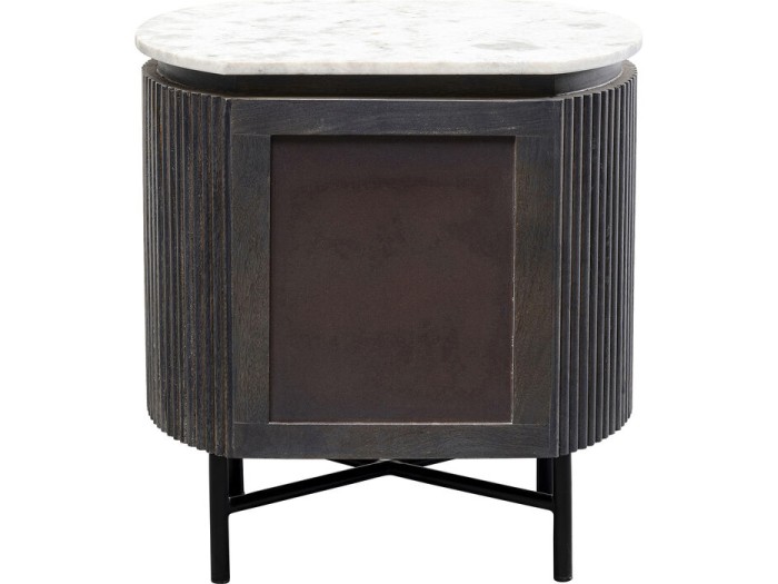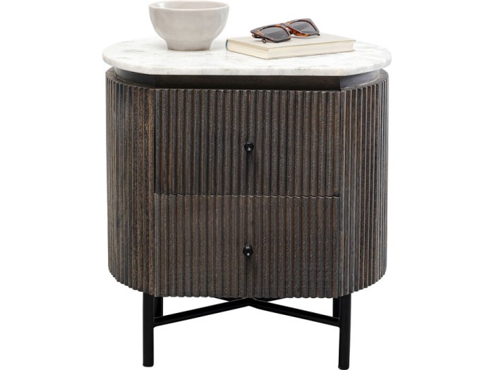 Ο σχεδιασμός της συλλογής επίπλων Glenn παίζει με τις αντιθέσεις. Κολακευτικές, λείες επιφάνειες εναλλάσσονται με ραβδωτές επιφάνειες. Το δροσερό, γκρι μάρμαρο προσδίδει σε αυτή τη συρταριέρα με τα δύο μεγάλα συρτάρια έναν πολύ κομψό χαρακτήρα. Με υάλωση και λάκα, οι ξύλινες επιφάνειες προστατεύονται και αναδεικνύονται καλά οι ζωντανοί κόκκοι που χαρακτηρίζουν το ξύλο μάνγκο. Όσο λειτουργική κι αν είναι η συρταριέρα σε όλα τα σημεία, εντυπωσιάζει επίσης με τον πολυτελή και υψηλής ποιότητας χαρακτήρα της.Μικρή συρταριέρα από μασίφ ξύλο σε μαύρο καπνό, 55 x 50 x 35 εκατοστά (υ/β/δ)