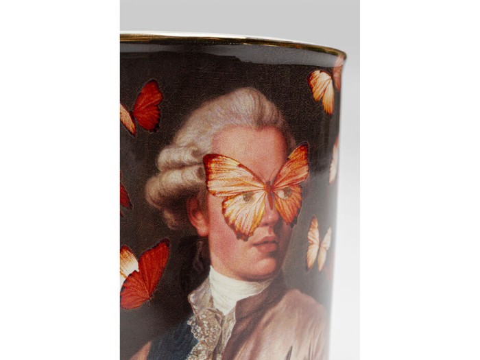 Κεραμική κούπα που έχει πάνω έναν δούκα με κόκκινες πεταλούδες.