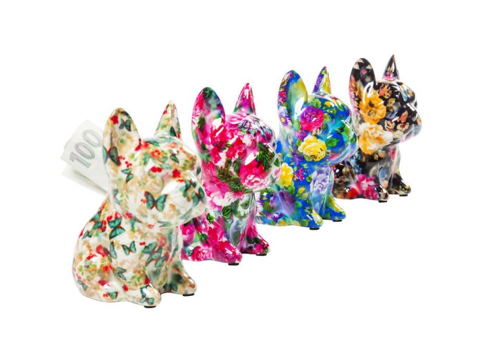 Πολύχρωμα μοτίβα διακοσμούν τους τετράποδους φίλους σε φόντο λουλουδιών. Τα χαριτωμένα Great Danes όχι μόνο φαίνονται κομψά, αλλά μπορούν επίσης να χρησιμοποιηθούν ως κουτάκι χρημάτων. Διατίθεται σε τέσσερις εκδόσεις.