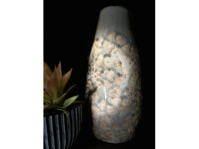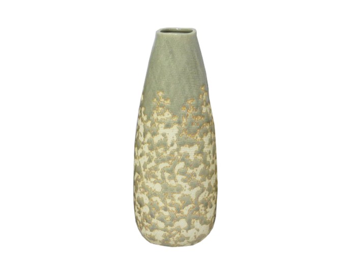 Το βάζο Mint συνδυάζει γήινη κομψότητα με σύγχρονη αισθητική, δημιουργώντας ένα ξεχωριστό διακοσμητικό στοιχείο για κάθε εσωτερικό χώρο. Η κεραμική του επιφάνεια σε απαλή απόχρωση μέντας και η ιδιαίτερη υφή με μοτίβο σε ανοιχτόχρωμους τόνους προσδίδουν έναν χαρακτήρα φυσικό και ζεστό. Χάρη στην ψηλόλιγνη γραμμή του, ενδείκνυται για τοποθέτηση σε πατώματα, τραπεζάκια ή κονσόλες. Η χρήση του είναι αυστηρά διακοσμητική, χωρίς τη δυνατότητα να γεμιστεί με νερό, καθιστώντας το ιδανικό για αποξηραμένα άνθη ή ως αυτόνομο διακοσμητικό.