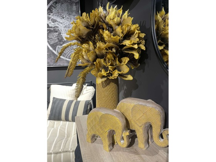 Το διακοσμητικό ελεφαντάκι AFRICANA 2 από πολυρεζίνη, διαστάσεων 29x13x22cm, ξεχωρίζει για τον έντονο κίτρινο χρωματισμό και τα γεωμετρικά μοτίβα που θυμίζουν αφρικανική τέχνη. Με προσεγμένες λεπτομέρειες και ζεστό φινίρισμα, αποτελεί ιδανικό στοιχείο για ethnic, boho ή και εκλεκτικά στυλ διακόσμησης. Ιδανικό για τοποθέτηση σε ράφια, κομοδίνα ή επιφάνειες προβολής, προσδίδει χρώμα και χαρακτήρα στον χώρο.