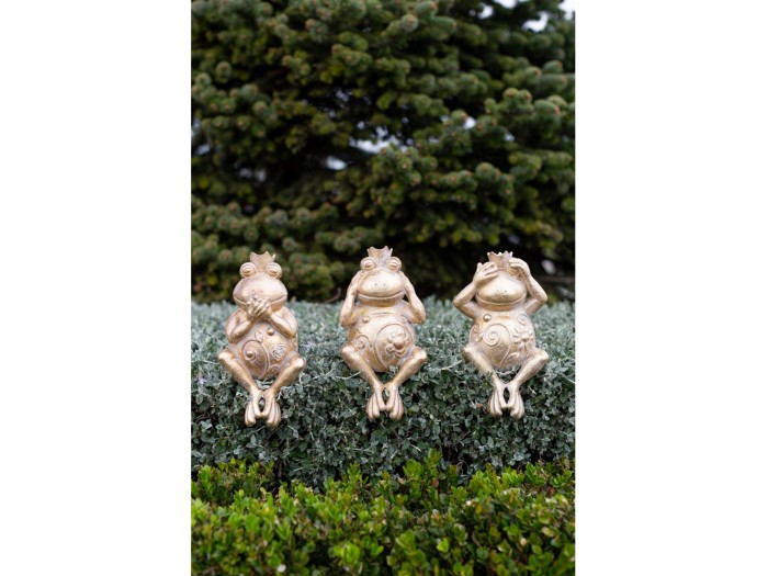 Ο τρίτος διακοσμητικός βάτραχος της σειράς GRENOUILLE ολοκληρώνει τη συμβολική τριάδα με τη στάση "δεν μιλώ για το κακό", κλείνοντας το στόμα του με τα χέρια. Με παιχνιδιάρικη έκφραση, περίτεχνα ανάγλυφα σχέδια και λαμπερή χρυσή απόχρωση, χαρίζει χιούμορ και διακριτική σοφία στη διακόσμησή σας. Κατασκευασμένος από ανθεκτική πολυρεσίνη, είναι ιδανικός για ράφια, βιτρίνες ή ως ξεχωριστό δώρο με νόημα.