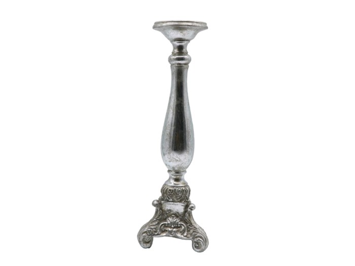 Κηροπήγιο GABI από polyresin σε ασημί απόχρωση με ανάγλυφες μπαρόκ λεπτομέρειες και διακριτικό vintage χαρακτήρα. Η εντυπωσιακή του βάση προσδίδει σταθερότητα και κομψότητα, ενώ το ύψος του το καθιστά ιδανικό για δημιουργία ατμόσφαιρας σε τραπεζαρίες, κονσόλες ή εορταστικές διακοσμήσεις.