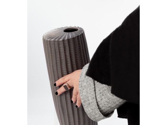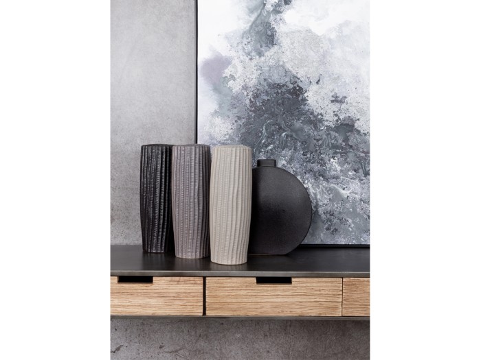 Το κεραμικό βάζο RIGE σε ανθρακί ματ υφή και διαστάσεις 12x12x36 cm είναι μια statement επιλογή για κάθε μοντέρνο εσωτερικό. Η κάθετη ανάγλυφη επιφάνειά του δημιουργεί ένα δυναμικό παιχνίδι φωτός και σκιάς, προσδίδοντας βάθος και χαρακτήρα στον χώρο. Ιδανικό για κονσόλες, ράφια ή τραπεζάκια, αναδεικνύει τη δύναμη της απλότητας μέσα από τη λεπτομέρεια. Αποκλειστικά διακοσμητικό – δεν προορίζεται για χρήση με νερό.