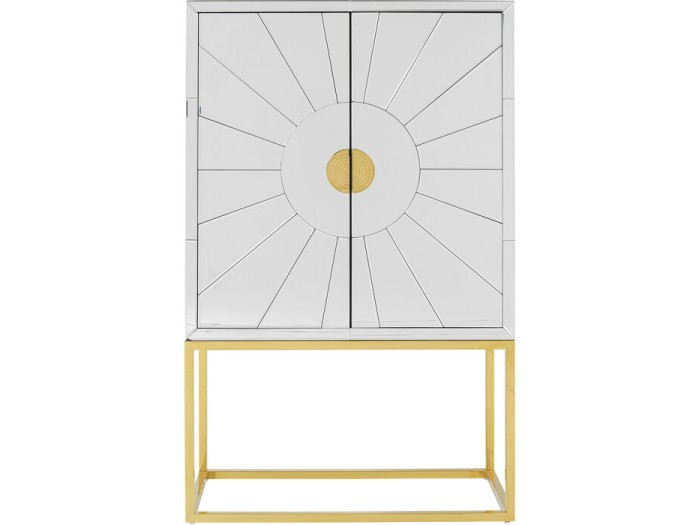 Ένα πολυτελές μπαρ με την εξολοκλήρου καθρεπτιζόμενη επικάλυψη θα φωτίσει οποιοδήποτε δωμάτιο με κομψό, glamorous ή ρετρό εσωτερικό στυλ. Η διακόσμηση των πολύπλευρων στοιχείων του καθρέφτη αποτελούν καλλιτεχνική σύνθεση σαν ένα μωσαϊκό.Διαθέτει τρία ράφια με δυνατότητα ρύθμισης ύψους και δύο συρτάρια για έξτρα αποθήκευση μπουκαλιών με εσωτερικό μαύρο χρώμα και ανθεκτική, ατσάλινη βάση λακαρισμένη σε χρυσό.