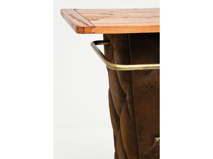 Είτε πρόκειται για μια άνετη μπύρα μετά τη δουλειά είτε για ένα μεγάλο πάρτι με φίλους, αυτό το μπαρ δίνει στις γιορτές σας ένα ξεχωριστό σκηνικό. Το μπροστινό μέρος είναι εξοπλισμένο με ένα καφέ κάλυμμα σε δερμάτινη εμφάνιση. Καθώς πρόκειται για συνθετικό ύφασμα, το κάλυμμα μπορεί απλώς να καθαριστεί με ένα υγρό πανί. Τα πόδια, το υποπόδιο και το κιγκλίδωμα παρέχουν μια αρμονική αντίθεση με τον ζεστό ορειχάλκινο τόνο τους σε εμφάνιση αντίκας και αναδεικνύουν οπτικά αυτό το μπαρ. Η πλάτη προσφέρει αρκετό χώρο για την αποθήκευση μπουκαλιών, ποτηριών και άλλων αξεσουάρ του μπαρ. Για το σκοπό αυτό διατίθενται συνολικά πέντε θήκες. Μια ενσωματωμένη θήκη μπουκαλιών φιλοξενεί συνολικά 9 μπουκάλια.