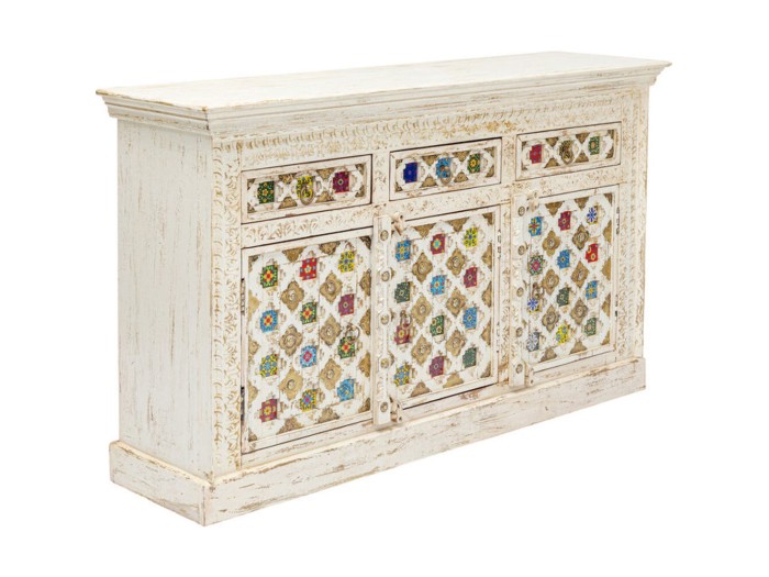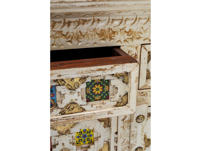 Ένα πραγματικά μοναδικό κομμάτι, αυτό το sideboard από φυσικό μασίφ ξύλο σε αντικέ στυλ, εντυπωσιάζει με τις πολύχρωμες κεραμικές πλακίδες, τις περίτεχνες ξυλογλυπτικές και τις μεταλλικές λεπτομέρειες σε απόχρωση ορείχαλκου. Εκτός από τη ζεστή του αισθητική, προσφέρει άφθονο αποθηκευτικό χώρο, γεγονός που το καθιστά ιδιαίτερα πρακτικό. Ένα έπιπλο σε shabby chic αισθητική, που γεμίζει τον χώρο με χαρακτήρα και ατμόσφαιρα.