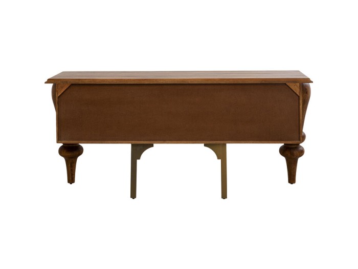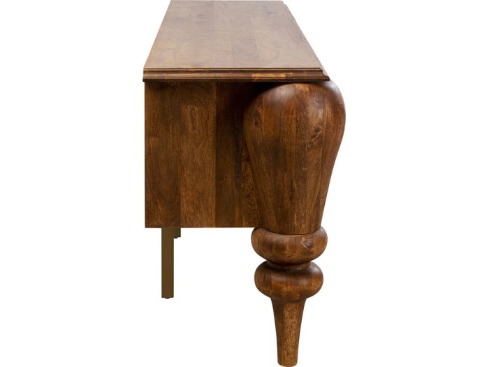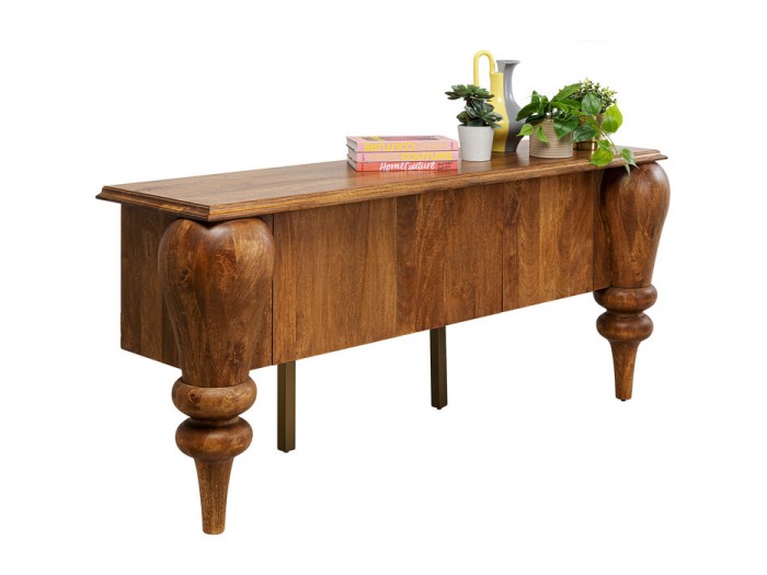Αυτός ο εξαιρετικός μπουφές από μασίφ ξύλο είναι βέβαιο ότι θα τραβήξει την προσοχή όλων των φίλων του design. Η αλληλεπίδραση των μπαρόκ μορφών σε ένα σύγχρονο πλαίσιο είναι συναρπαστική. Η τολμηρή συγχώνευση δημιουργεί ένα μοναδικό σημείο εστίασης στο δωμάτιο. Οι σχεδιαστές εσωτερικών χώρων συνιστούν έπιπλα δήλωσης για να προσδώσουν χαρακτήρα και ατομικότητα στα δωμάτια. Τέτοια κομμάτια αφηγούνται ιστορίες, κεντρίζουν το ενδιαφέρον και σπάνε τις συμβάσεις. Αυτός ο μπουφές της KARE είναι κάτι περισσότερο από ένα απλό έπιπλο - είναι τέχνη που κάνει τα δωμάτια να μιλούν. Το ξύλο μάνγκο που έχει χρησιμοποιηθεί προσφέρει φυσική ομορφιά, ανθεκτικότητα και φιλικότητα προς το περιβάλλον. Η χαρακτηριστική του δομή και η στιβαρότητα το καθιστούν ιδανικό για κομψά, μακράς διάρκειας έπιπλα. Το ξύλο μάνγκο είναι φιλικό προς το περιβάλλον επειδή προέρχεται από διαχειριζόμενη δασοκομία. Τα δέντρα κόβονται μόνο όταν δεν αποδίδουν πλέον καρπούς. Επιπλέον, τα δέντρα μάνγκο αναπτύσσονται γρήγορα.Καφέ ξύλινος μπουφές με ρυθμιζόμενα κατά ύψος ράφια, 88 x 200 x 56 cm (Υ/Β/Δ)