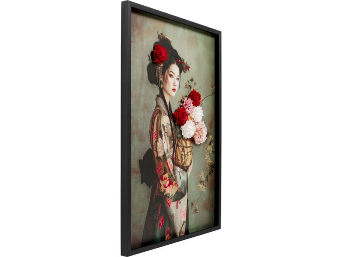 Ένα εντυπωσιακό έργο τέχνης που συνδυάζει την κομψότητα της Ανατολής με τη μοντέρνα αισθητική του 3D design. Το Geisha With Flowers 3D απεικονίζει μια γκέισα ντυμένη με παραδοσιακό κιμονό, κρατώντας ένα βάζο με τρισδιάστατα άνθη σε αποχρώσεις του κόκκινου, του ροζ και του λευκού. Οι λεπτομέρειες του υφάσματος και η ήρεμη έκφραση της μορφής αποπνέουν γαλήνη και χάρη, ενώ η ανάγλυφη υφή των λουλουδιών προσθέτει ζωντάνια και βάθος στη σύνθεση. Το μαύρο πλαίσιο ολοκληρώνει αρμονικά το έργο, προσφέροντας μια σύγχρονη πινελιά σε έναν χώρο με πολιτισμικό και καλλιτεχνικό χαρακτήρα.| Μήκος | 84 |