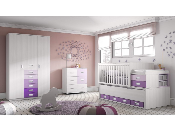 Βρεφικό δωμάτιο αποτελούμενο από πολυμορφική κούνια με 4 συρτάρια και συρόμενο κρεβάτι, ράφι τοίχου συρταριέρα 6 ράφια και 3φυλλη ντουλάπα με 6 συρτάρια