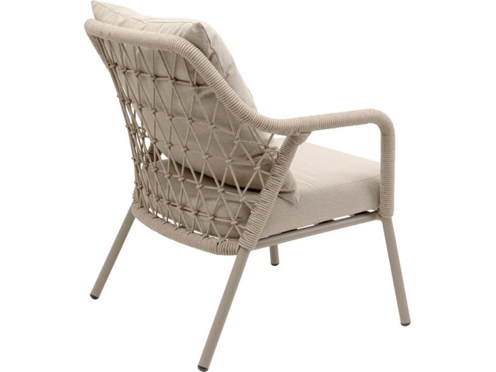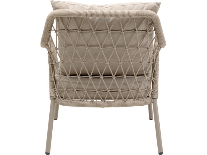 Η λεπτή γεωμετρική πλέξη χαρίζει ελαφρότητα και κομψότητα στη σιλουέτα της πολυθρόνας, αναδεικνύοντας τον σύγχρονο χαρακτήρα της. Το ανθεκτικό πλέγμα από πολυαιθυλένιο είναι εύκολο στη συντήρηση και κατάλληλο για καθημερινή χρήση σε εξωτερικούς χώρους, ενώ τα άνετα μαξιλάρια καθίσματος και πλάτης προσφέρουν υψηλό επίπεδο άνεσης για στιγμές χαλάρωσης.