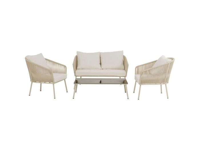 Ένα κομψό και άνετο σετ επίπλων εξωτερικού χώρου σε φυσική μπεζ απόχρωση, ιδανικό για μπαλκόνια, βεράντες και κήπους. Ο αρμονικός συνδυασμός μεταλλικού σκελετού με ανθεκτικό poly-rope στην πλάτη δημιουργεί μια μοντέρνα αλλά ταυτόχρονα ζεστή αισθητική που ταιριάζει σε κάθε στιλ διακόσμησης. Τα αφράτα μαξιλάρια προσφέρουν υψηλό επίπεδο άνεσης, ενώ το τραπεζάκι με επιφάνεια από tempered colored glass προσθέτει μια διακριτική νότα πολυτέλειας και λειτουργικότητας. Η στιβαρή κατασκευή, οι υψηλές αντοχές φορτίου και τα ποιοτικά υλικά εξασφαλίζουν μακροχρόνια διάρκεια σε εξωτερικές συνθήκες. Το σετ παραδίδεται μερικώς συναρμολογημένο για εύκολη εγκατάσταση και αποτελεί ιδανική λύση για όσους θέλουν να δημιουργήσουν έναν χαλαρωτικό, φιλόξενο χώρο εξωτερικής διαβίωσης.
