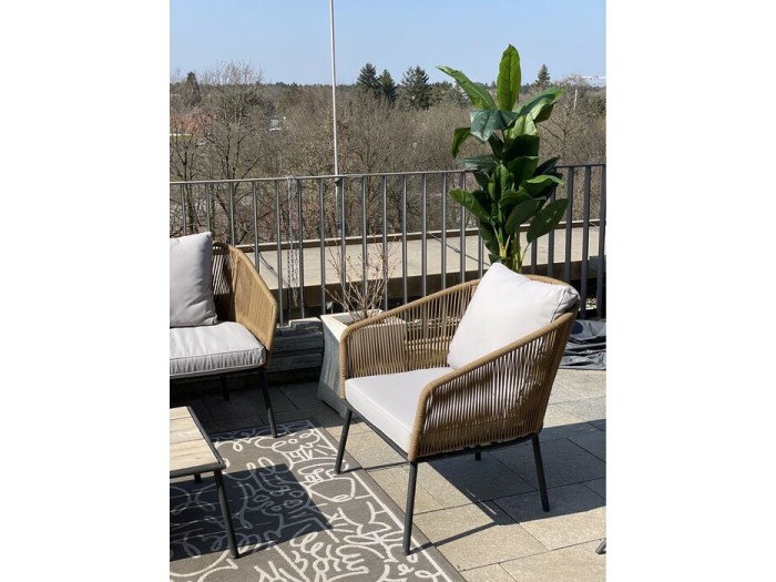 - Έναν καναπέ διθέσιο με υφασμάτινα γκρι μαξιλάρια. Η ταπετσαρία σε κομψό γκρι είναι μοντέρνα και ανθεκτική στις καιρικές συνθήκες