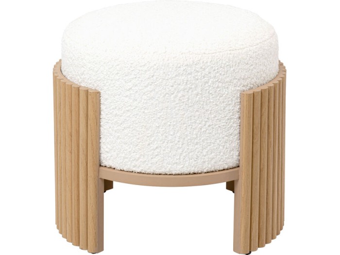 Ένα κομψό και ιδιαίτερο σκαμπό που συνδυάζει φυσικά υλικά με σύγχρονη αισθητική, προσθέτοντας ζεστασιά και χαρακτήρα σε κάθε χώρο. Η κυλινδρική του μορφή με την απαλή, υφασμάτινη επένδυση σε λευκή απόχρωση δημιουργεί μια cozy αίσθηση, ενώ η βάση με τις κάθετες ξύλινες λεπτομέρειες σε φυσικό χρώμα προσφέρει ένα εντυπωσιακό design contrast.