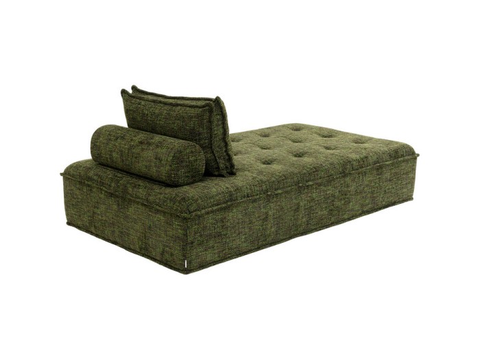 Η recamiere Portofino Green είναι το απόλυτο lounge κομμάτι για όσους θέλουν άνεση και στιλ σε ένα έπιπλο. Η πλούσια υφασμάτινη επένδυση σε βαθύ πράσινο χρώμα θυμίζει πολυτελές boutique hotel, ενώ το καπιτονέ κάθισμα της δίνει διαχρονική, κομψή εμφάνιση. Ιδανική για σαλόνι, reading corner ή ακόμα και για υπνοδωμάτιο, προσφέρει μεγάλο, αναπαυτικό χώρο για ξάπλωμα και χαλάρωση. Το παχύ στρώμα μαλακής πολυουρεθάνης σε συνδυασμό με τα δύο μαξιλάρια (ένα ρολό και ένα ορθογώνιο) εξασφαλίζουν στήριξη σε πλάτη και αυχένα, ενώ το ανθεκτικό ύφασμα με υψηλή αντοχή στη φθορά υπόσχεται μακροχρόνια χρήση χωρίς άγχος. Ένα κομμάτι που “γεμίζει” τον χώρο, χαρίζει χρώμα και προσκαλεί σε στιγμές απόλυτης ξεκούρασης.