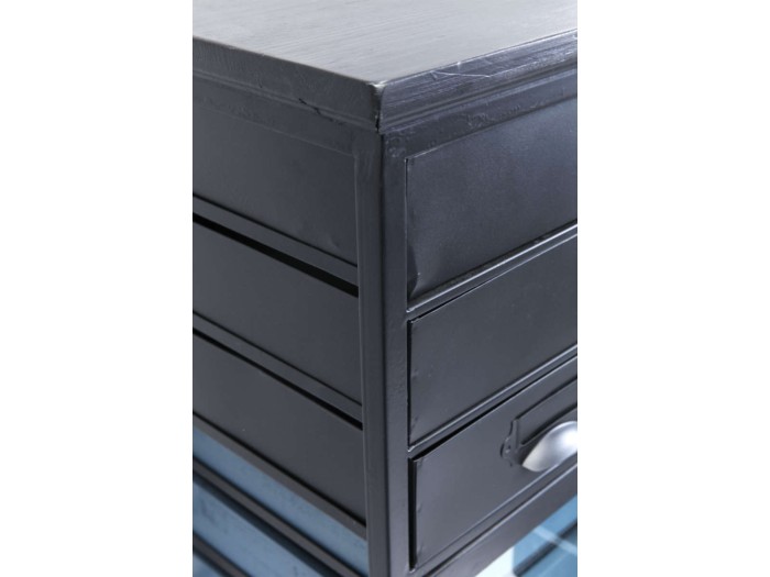 Σαν να ανακαλύφθηκε σε ένα εγκαταλελειμμένο εργαστήριο: αυτή η μαύρη λακαρισμένη συρταριέρα από ξύλο και μέταλλο μοιάζει να κουβαλάει μια ενδιαφέρουσα ιστορία – και αυτό ακριβώς την κάνει τόσο γοητευτική.