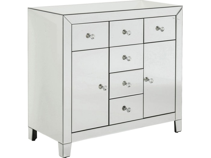 Αυτή η κομψή συρταριέρα είναι αντάξια του ονόματός της, με επιφάνειες από καθρέφτη και κομψά, κομψοτεχνικά χερούλια. Με έξι συρτάρια και δύο ντουλάπια, προσφέρει άφθονο αποθηκευτικό χώρο — ιδανικό για ρούχα, αξεσουάρ ή ακόμα και για να φιλοξενήσει ένα μίνι μπαρ με στιλ. Ανήκει στη σειρά Luxury, μια συλλογή από έπιπλα με καθρέφτη που συνδυάζουν λάμψη, λειτουργικότητα και αισθητικό αποτέλεσμα.