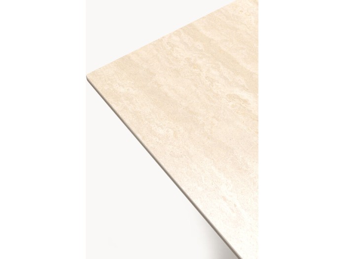 Η επιφάνεια σε travertin greige απόχρωση (ένα κομψό πάντρεμα beige και grey) αποπνέει φυσική κομψότητα, ενώ το κεραμικό stoneware με γυαλισμένο φινίρισμα προσφέρει ανθεκτικότητα και πρακτικότητα στην καθημερινή χρήση. Η βάση από ατσάλι με powder-coated επεξεργασία σχηματίζει δύο δυναμικά, καμπυλωτά στοιχεία που δημιουργούν ένα εντυπωσιακό visual effect, δίνοντας στο τραπέζι μια σχεδόν καλλιτεχνική υπόσταση.