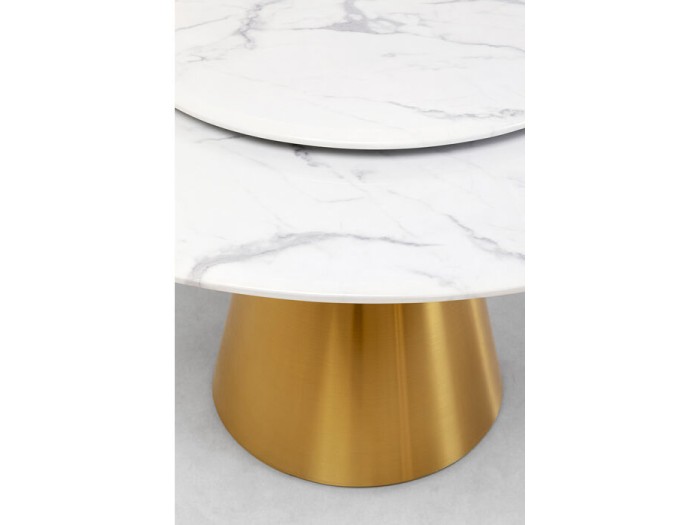 Μια εντυπωσιακή τραπεζαρία, η οποία έχει πόδι μεταλλικό σε χρυσό χρώμα και στρογγυλή μαρμάρινη επιφάνεια σε χρώμα λευκό, η οποία είναι περιστρεφόμενη.