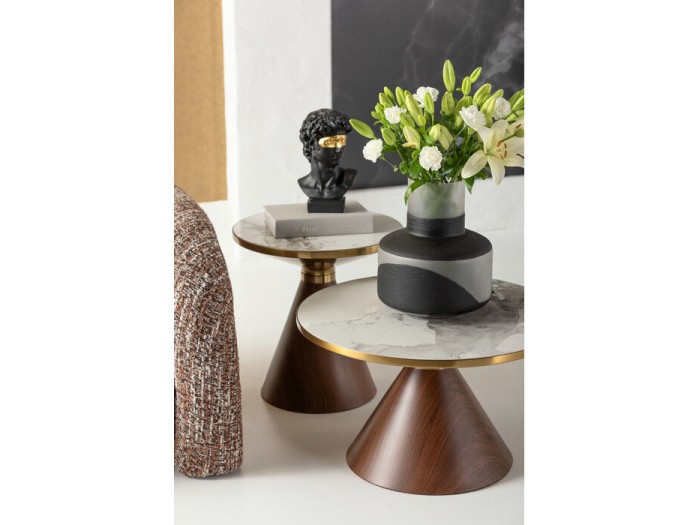 Το τραπέζι μέσης Cono είναι ένα κομψό και λειτουργικό τραπέζι με ξύλινη καφέ βάση και κεραμική επιφάνεια με όψη μαρμάρου με χρυσές λεπτομέρειες. Με διαστάσεις 70x70x42 εκατοστά, προσφέρει άνετο χώρο για να τοποθετήσετε διάφορα αντικείμενα.| Μήκος | 70 |
