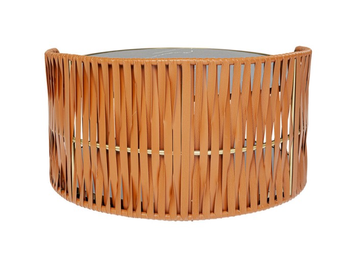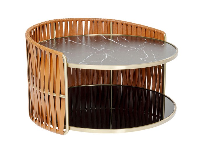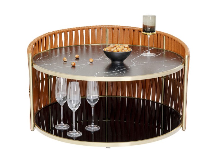 Η ορειχάλκινη γυαλάδα, το μαρμάρινο φινίρισμα και οι καφέ δερμάτινες τιράντες δίνουν σε αυτό το τραπέζι έναν πολυτελή, μοναδικό χαρακτήρα