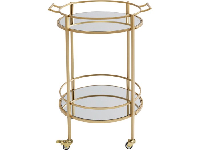 Ένα τροχηλάτο, στρόγγυλο μπαρ με δύο επίπεδα που φέρνει την απόλυτη αίσθηση της πολυτέλειας και χαρίζει άριστη κομψότητα στον χώρο σας. Το ιδιαίτερα κλασσικό σχέδιο του με τις γυάλινες καθρεπτιζόμενες επιφάνειες, σε συνδυασμό με το εξολοκλήρου χρυσό βερνίκωμα της ατσάλινης βάσης θα προσθέσει μια glam πινελιά στα πάρτι σας και θα εντυπωσιάσει μοναδικά τους καλεσμένους.Μέγιστη ικανότητα φόρτωσης βάρους: 30 κιλά.