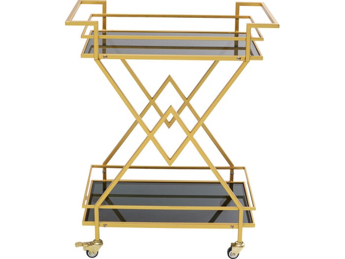 Ένα τροχηλάτο μπαρ με δύο επίπεδα που φέρνει την απόλυτη αίσθηση της πολυτέλειας και χαρίζει άριστη κομψότητα στον χώρο σας. Το ιδιαίτερο σχέδιο των πυραμίδων στα πλαϊνά του με τις σκούρες γυάλινες επιφάνειες, σε συνδυασμό με το εξολοκλήρου χρυσό βερνίκωμα της βάσης θα προσθέσει μια glam πινελιά στα πάρτι σας και θα εντυπωσιάσει μοναδικά τους καλεσμένους.| Μήκος | 65 |