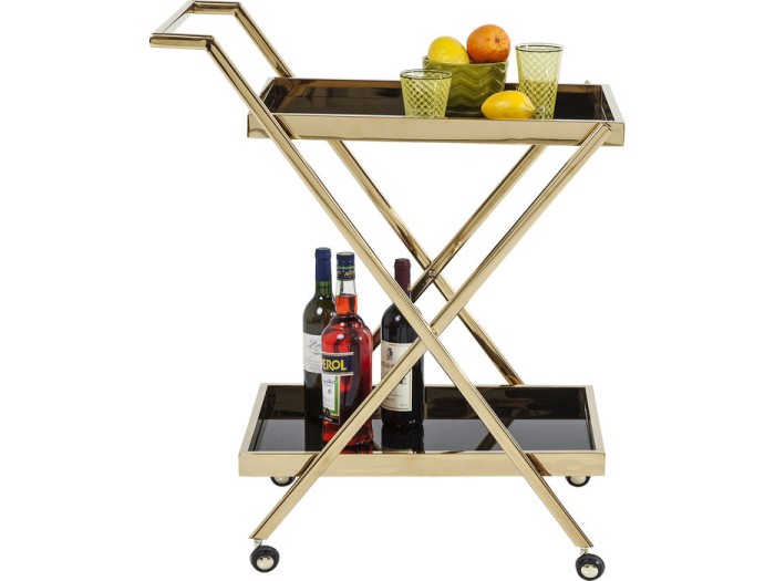 Μια μερίδα στυλ. Είτε πρόκειται για τζιν με τόνικ, ουίσκι ξινό, μαρτίνι ή κοσμοπολίτικο, με αυτό το καροτσάκι μπαρ τα ποτά παρουσιάζονται με στυλ. Προσφέρει χώρο σε δύο επίπεδα για την κομψή παρουσίαση και μεταφορά ποτών, σνακ κ.λπ. Ο αποκλειστικός συνδυασμός χρωμάτων και υλικών από ανοξείδωτο ατσάλι χρώματος ορείχαλκου και μαύρο γυαλί ασφαλείας προσφέρει μια πινελιά πολυτέλειας και αίγλης. Τέσσερις τροχίσκοι καθιστούν αυτό το καροτσάκι σερβιρίσματος κινητό, πράγμα που σημαίνει ότι όχι μόνο φαίνεται ωραίο στο μάτι, αλλά και εντυπωσιάζει με τις πρακτικές του αρετές.