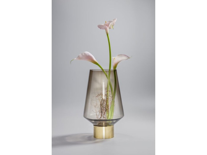 Χειροποίητο γυάλινο βάζο σε κομψή, απλή γραμμή καφέ απόχρωσης, με χρυσαφένια μεταλλική ατσάλινη βάση ορειχάλκινης επίστρωσης.