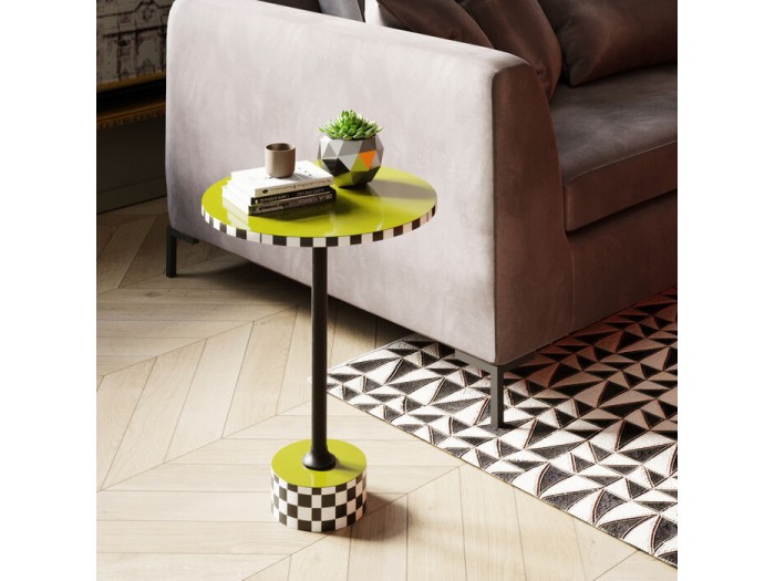 Ένα εντυπωσιακό βοηθητικό τραπεζάκι με μεταλλικό μαύρο σκελετό και βάση και επιφάνεια από mdf σε στρογγυλό σχήμα, με μοτίβο σκακιέρας και σε χρώμα λαδί. Μια εξαιρετική επιλογή για τον χώρο σας!