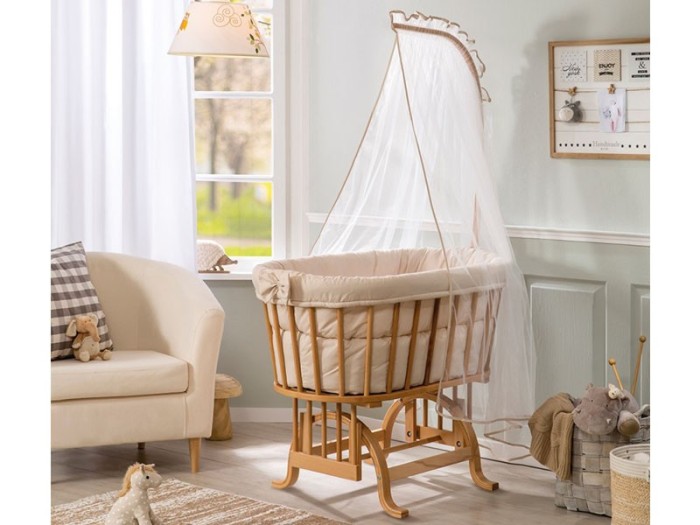 Βρεφικό λίκνο για μωρά 0-6 μηνών, το βρεφικό λίκνο είναι κουνιστό έτσι ώστε σας βοηθάει να νανουρίσετε το μωρό σας χωρίς να το έχετε αγκαλιά, το βρεφικό λίκνο περιλαμβάνει όλη την προίκα μωρού από το στρώμα, την πάντα, το μαξιλάρι και την κουνουπιέρα.