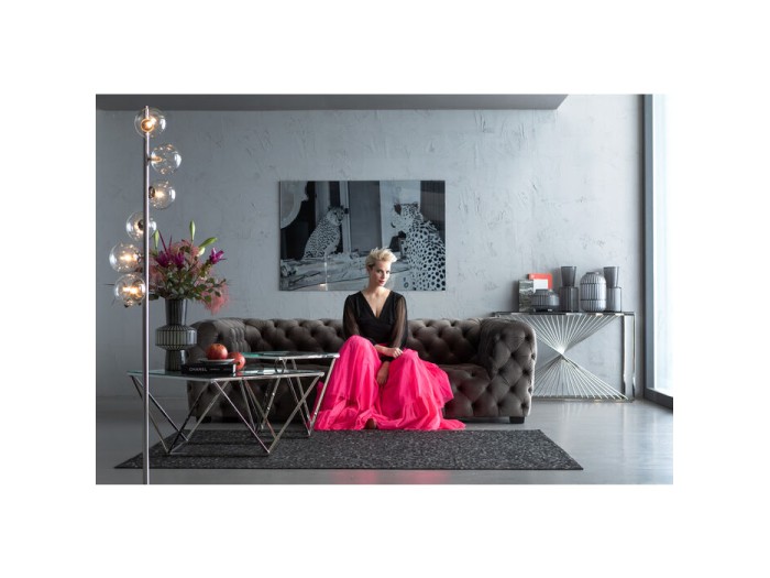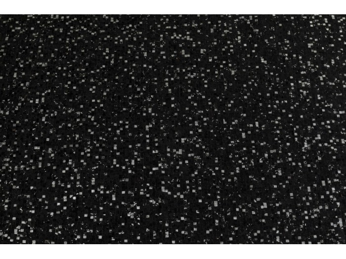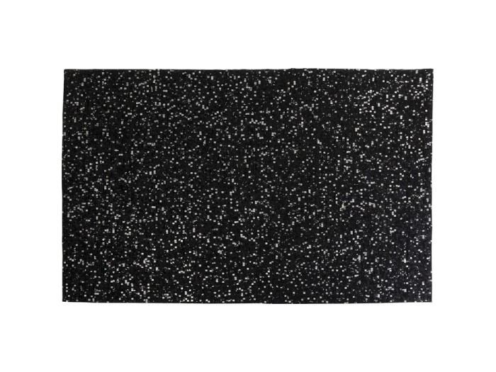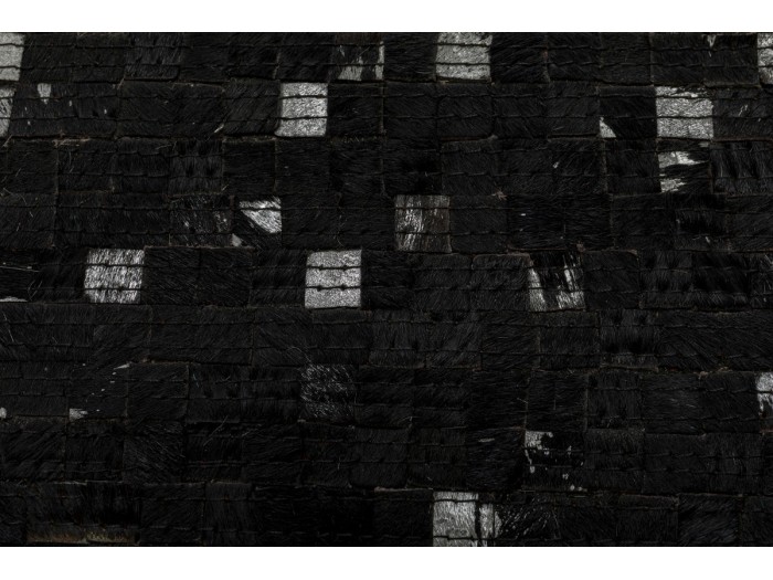 Χαλί σε μαύρο χρώμα με λευκές λεπτομέρειες από δέρμα αγελάδας . Η κάτω πλευρά είναι από 100% βαμβάκι ενώ η πάνω έχει επικάλυψη μεταλλικού φύλλου.